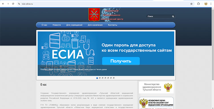 С первого взгляда и главной страницы всё благопристойно: «Создание Государственного учреждения здравоохранения «Тульский областной медицинский информационно-аналитический центр» утверждено приказом Министерства здравоохранения и социального развития Российской Федерации от 07.10.2005 года № 627, и является учреждением здравоохранения особого типа». Плюс баннеры ЕСИА, «Доктор71» и т.д.