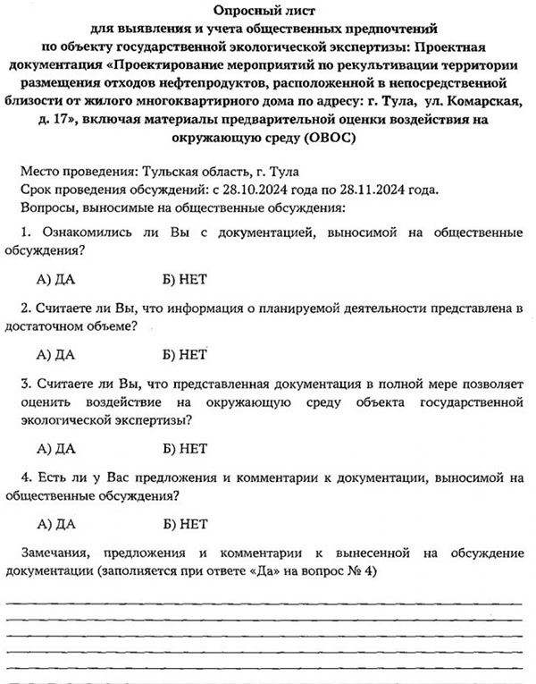 Обсуждения пройдут в формате опроса. В распоряжении главы администрации города Тулы от 23 октября 2024 года был опубликован срок проведения анкетирования — с 28 октября по 28 ноября — а также список вопросов, на которые предлагается ответить. Заказчиком общественных обсуждений является главное управление администрации города Тулы по Пролетарскому территориальному округу.