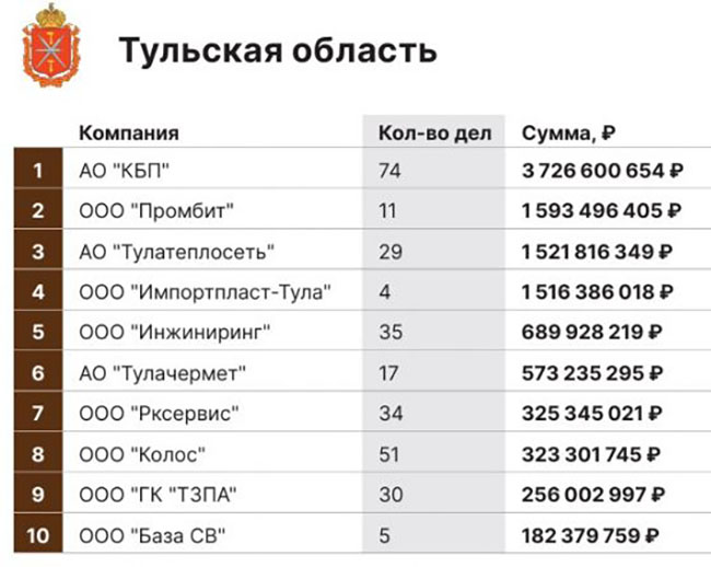 Тульское Конструкторское бюро приборостроения возглавило рейтинг самых «дорогих» тульских компаний по сумме арбитражных исков. Такие данные опубликовал «Бизнес Журнал: Центр».