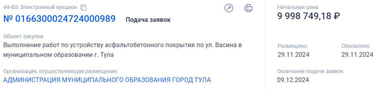 На сайте госзакупок появился лот «асфальтирование улицы Васина в Туле». Прием заявок заканчивается 9 декабря. Однако уже 2 декабря на участке был уложен щебень и начаты строительные работы.