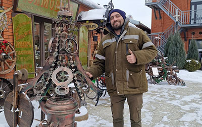— Ёлка сделала из металлолома — из того, что валяется по гаражам, по металлоприемкам. Там есть люстры, детали от коробок передач всяких автомобилей, лапы — из листового металла. Шестеренки, самоварчики вырезаны на лазерном станке с ЧПУ. Это основа композиции, — говорит умелец.