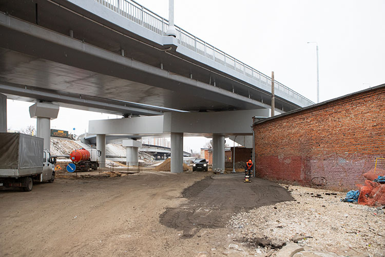 Да и сам подход к мосту со стороны ул. Мосина выглядит вполне хаотичным. Со стороны ул. Ф. Смирнова тротуар есть только до трамвайных путей. Дальше пешехода ожидает асфальтированная автомобильная дорога вдоль автосервисов, а потом идти можно только по газону мимо гаражей. Если нужно перейти проезжую часть, чтобы направиться в сторону Заречья, безопасно это можно сделать только на следующем перекрестке с ул. Фрунзе. К нему путь лежит опять же исключительно по газону вдоль гаражей.