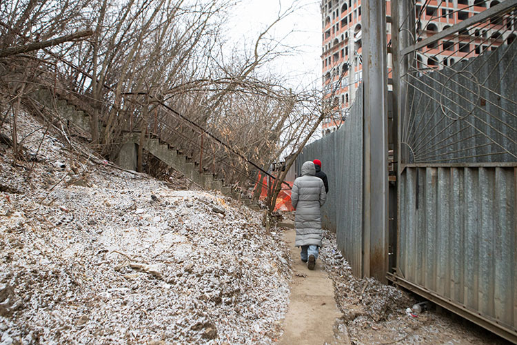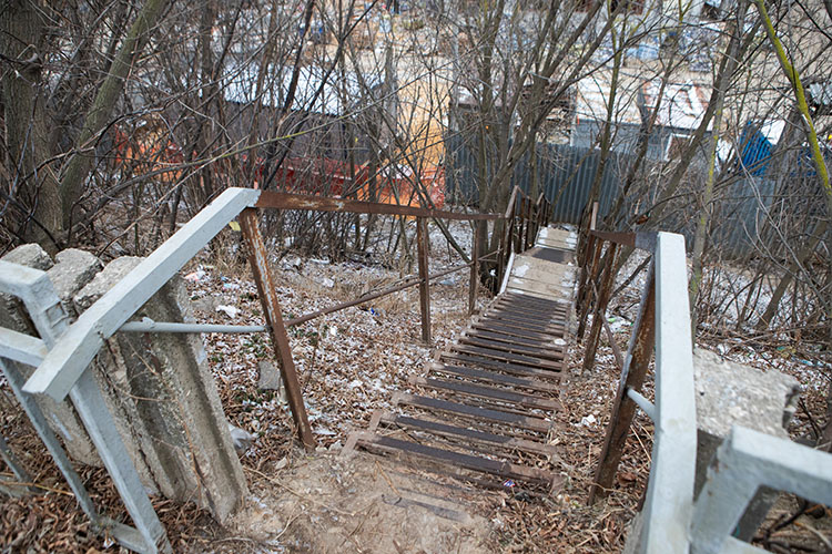На противоположной стороне пешеходов тоже ждет не менее крутой подъем по старой ржавой лестнице, которую окружают горы мусора и кусты.
