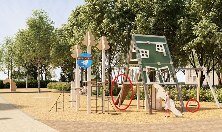 А вот у этих качелей другая проблема. Их зачем-то подвесили на уровне 1-1,5 метра над землей. Едва ли на них смогут забраться маленькие дети. Кроме того, рядом с площадкой хотят сделать небольшой полукруг с газоном. Очевидно, что дети будут по нему бегать к качелям, поэтому трава здесь долго не проживет.