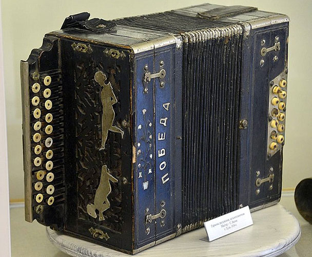 Вот, например, Гармонь «Победа», сделанная в 1934 году. Она прошла со своим владельцем всю войну. Металлические девушки сделаны из фюзеляжа сбитого фашистского самолета.