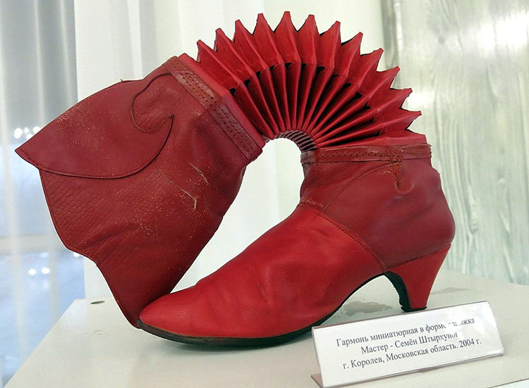 Есть в музее и совсем необычные модели, например гармонь-сапог, сделанная мастером Семеном Штырхуновым. Корпус инструмента — настоящий хореографический сапог, у которого от танцев даже слегка сбит каблучок. Но при этом модель рабочая, и сам мастер выступал с ней на сцене Кремлевского дворца.