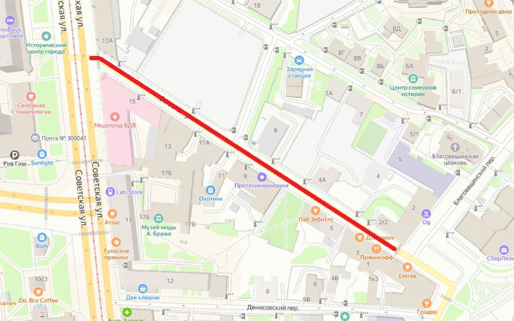 В Туле в целях обеспечения безопасности дорожного движения с 15:00 часов 17 января до полуночи 25 января 2025 года… ограничено движение всех видов транспорта по улице Союзной. Проезд… закрыт на участке от Советской до Благовещенского переулка.