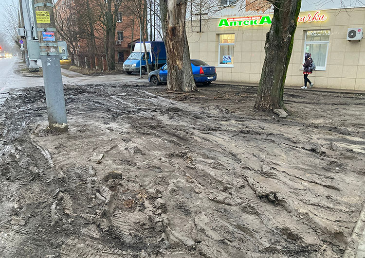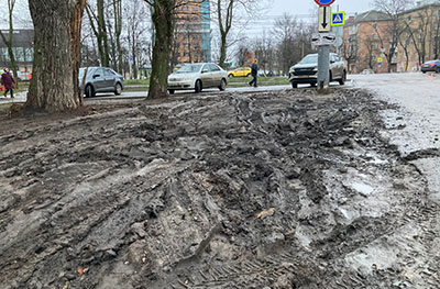 Эти фото сделаны [1 февраля]. Пересечение проспекта Ленина и улицы Волнянского, а также газон поблизости, на пр. Ленина, 100, который исполосовали доставщики. Комментарии излишни.