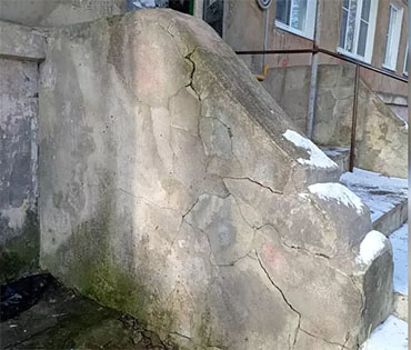 «Уже с 2023 года у начали обваливаться пороги, в них стали появляться дыры, перила покрылись трещинами – буквально по камням это всё распадается. Фасад дома у нас, как я это называю, — «обнять и плакать». Он выглядит просто ужасно. Там множество трещин, сырость всё делает ещё хуже», — рассказывает Мария.