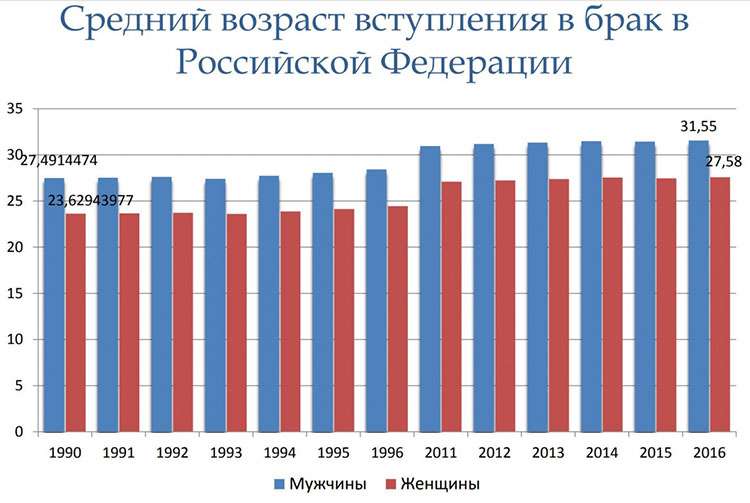 А официальная общероссийская статистика неумолима: в России средний возраст женихов был выше, чем средний возраст невест:
