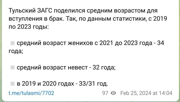 Около года назад тульские СМИ со ссылкой на региональный комитет по делам ЗАГС стали информировать читателей не только о ежемесячном количестве браков, но и о среднем возрасте женихов и невест. Вот, например, информация за январь 2025 года: