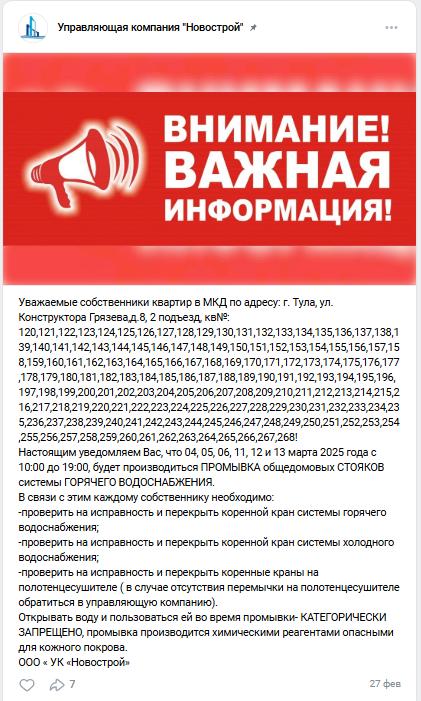 «Настоящим уведомляем вас, что 04, 05, 06, 11, 12 и 13 марта 2025 года с 10:00 до 19:00, будет производиться ПРОМЫВКА общедомовых СТОЯКОВ системы ГОРЯЧЕГО ВОДОСНАБЖЕНИЯ.