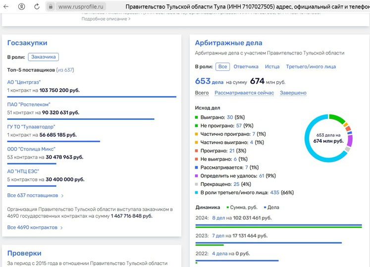 Кроме Правительства Тульской области ООО «Столица Микс» в 2023-2024 годы заключала 4 контракта с ГУ ТО «Аппарат Общественной Палаты Тульской Области», на 2,24 млн рублей, 6 госконтрактов на сумму 888 тысяч рублей в 2018-2019 годы заключили с Министерством сельского хозяйства Тульской области. С ГУК ТО «Объединение центров развития культуры» фирма в 2019 году заключила 4 контракта на общую сумму в 776 тысяч рублей. Все услуги – по организации питания. Всего же юрлицо являлось поставщиком в 32 государственных контрактах на сумму 34,9 млн рублей.
