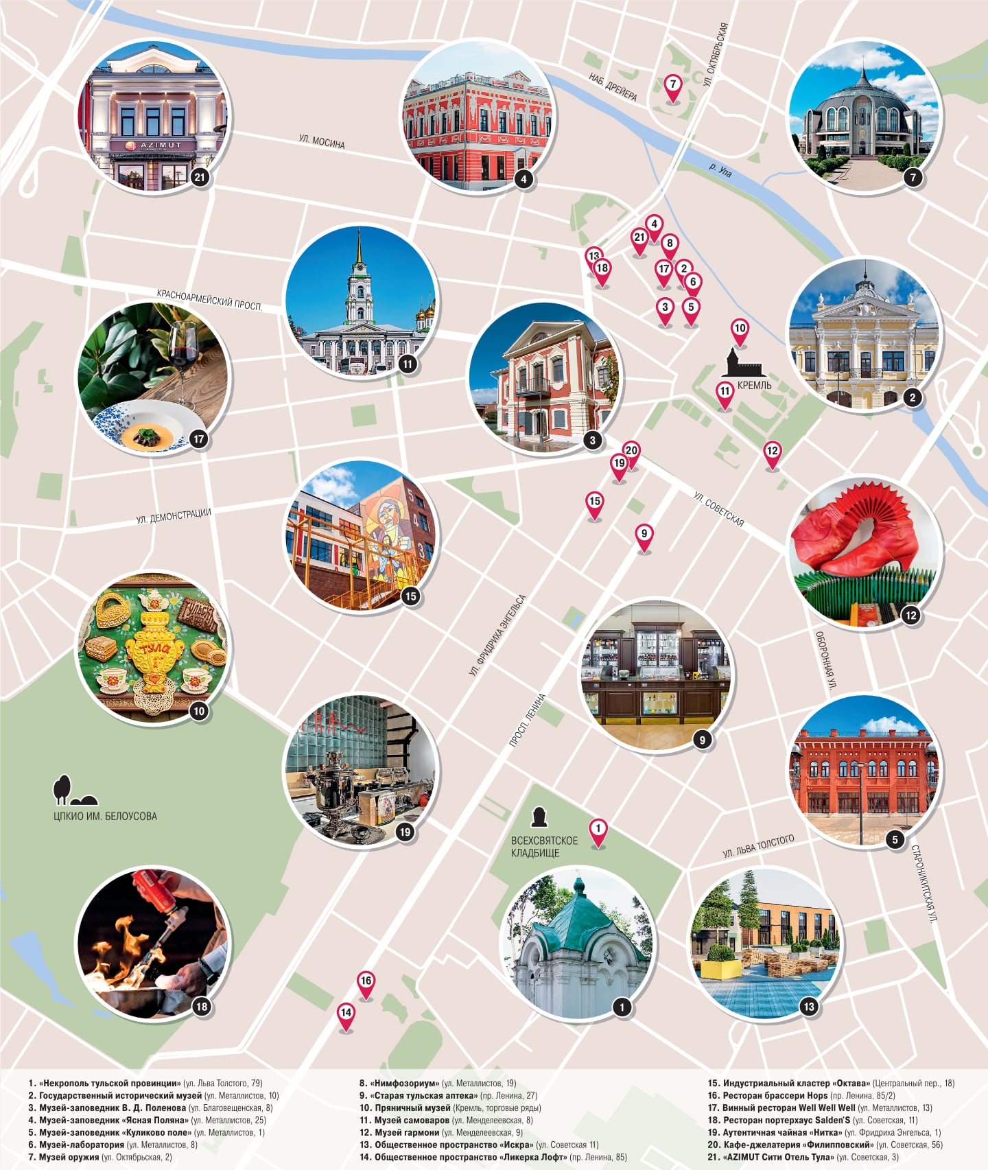 После реконструкции в 2018 году у Тулы наконец-то появилась и вполне дизайнерская Казанская набережная, созданная по проекту знаменитого бюро Wowhouse. Несколько веков на ее месте располагались склады стоящего аккурат напротив кремля Тульского оружейного завода! После масштабного облагораживания тут открылся многоуровневый променад с деревянными мостками, фототочками, продуманной подсветкой, игровыми площадками и кофе-спотами. От кремля отходит историческая — и почти семь лет назад ставшая пешеходной — улица Металлистов с фотогеничными особняками, под крышей которых сейчас музеи, рестораны и магазины. В ее начале красуется единственный в стране шестиметровый памятник самовару с фигурами мастеров и жанровыми сценами. А с южной стороны кремля простирается центральная площадь Тулы, от которой уходит главная улица города — проспект Ленина с историческими зданиями разных эпох и стилей. В хорошую погоду особенно приятно прогуляться в Центральном парке культуры и отдыха, а среди мест, мало известных у туристов, местные жители рекомендуют старинное Всехсвятское кладбище, «Некрополь тульской провинции» с монументальным кафедральным собором и семейными склепами.