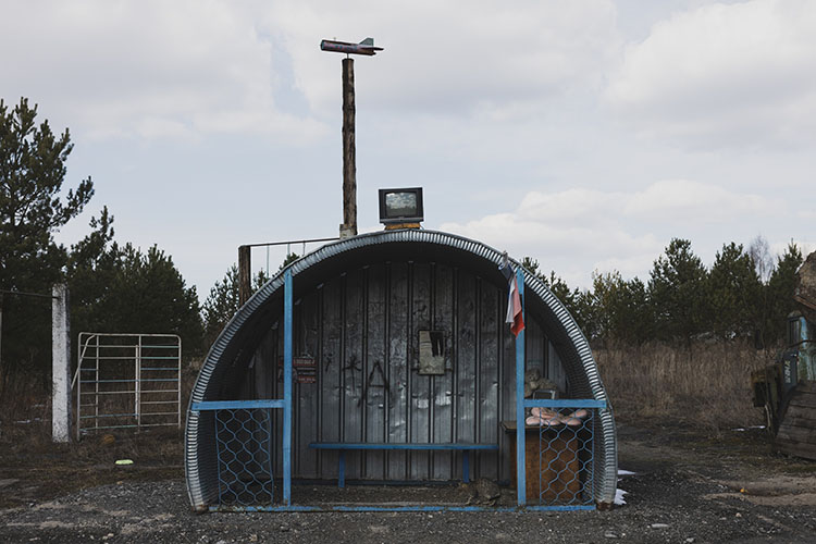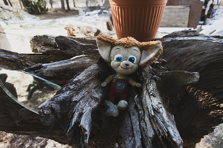 Рядом — подобие игровой зоны на открытом воздухе. Детские игрушки в заброшенной телеге, на деревьях и столах, красные весы, сломанные телефоны… От поскрипывающих на ветру каруселей и колясок среди деревьев жутко.