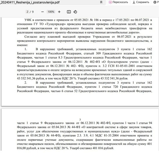 Казначейство из Татарстана при проведении финансовой проверки обнаружило множество нарушений. Выяснилось, что «Тулаупрадор» принял и предъявил к оплате затраты на возведение временных титульных зданий и сооружений в отсутствие документов, фиксирующих виды и объемы фактически выполненных работ на сумму 43,5 млн рублей. Кроме того, в «Тулаупрадор» приняли к оплате первичные учетные документы, содержащие фактически невыполненные работы по очистке кварцевым песком, обезпыливанию и обезжириванию поверхностей на общую сумму 401 тысячу рублей.
