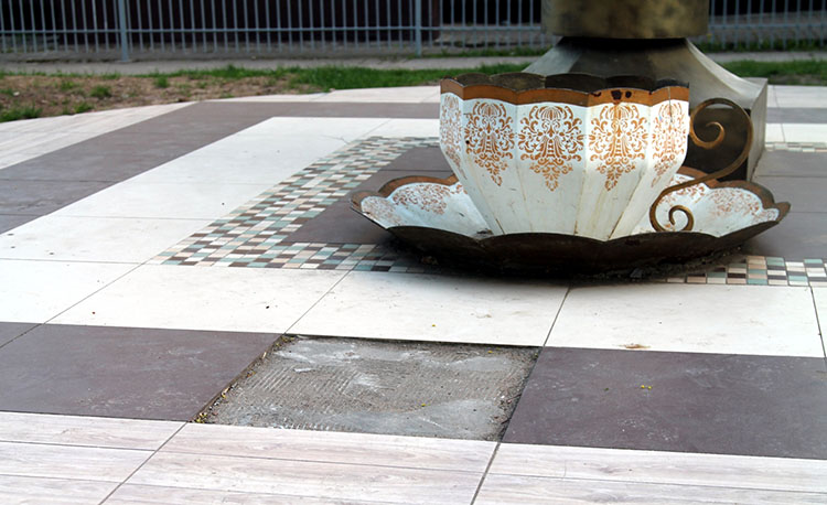 Да и основание композиции пришло в состояние нестояния, плитка отвалилась, всё ржавеет и выглядит крайне убого.