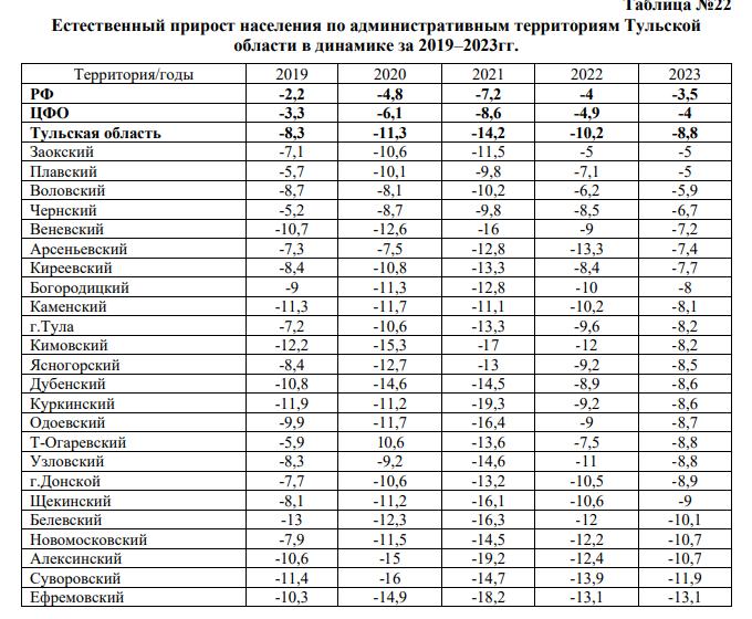 Во всех муниципалитетах Тульской области зафиксирована естественная убыль населения в 2023 году. Особенно значительна она в Ефремовском, Суворовском, Алексинском, Новомосковском и Белёвском районах, отметили в региональном Роспотребнадзоре.