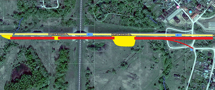 А вот чего предлагаю, не надо делать дорогу (расширять) с помощью грунта. И дорого и долго. Делаем отсыпку только в трёх местах (желтым нарисовал, как смог) и используем эти отсыпки как строительные площадки и опору для пролётов (изобразил красным, полусухим). А саму дорогу делаем просто на бетонных опорах, как обычные путепроводы. Вся Москва так нынче делает и не парится. Оно и быстрее получится, а значит будет (нет) шанс уложится в смету.