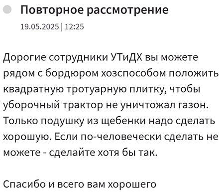 Простейший вопрос. Уборочный трактор вспахал газон. Ширины тротуара не хватает. Что нужно сделать? Может чуть расширить тротуар положив дополнительные пол метра асфальта или плиточку? Нет! Нужно придумать массу отписок, но ни в коем случае никак не решать проблему! И всё по ГОСТам, законам и правилам.