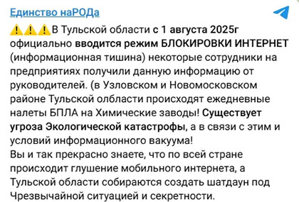В Сети появились сообщения, что с 1 августа в Тульской области из-за частых налетов БПЛА официально введут режим полной блокировки интернета