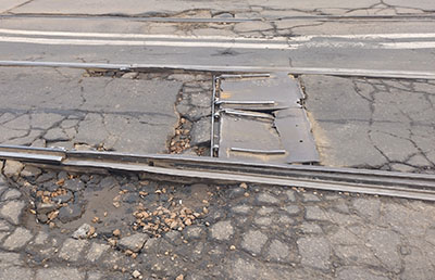Я смотрю на трамвайные пути, и из всех приличных слов, кроме междометий, у меня ничего не остаётся. Это просто позор, содержать рельсы в таком состоянии. На трамвайных путях ямы, рельсы рвутся, межрельсовое пространство в ужасном состоянии.