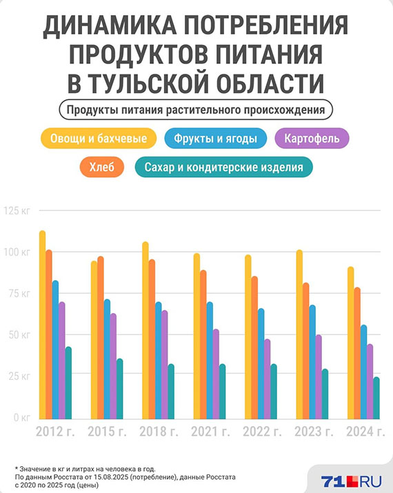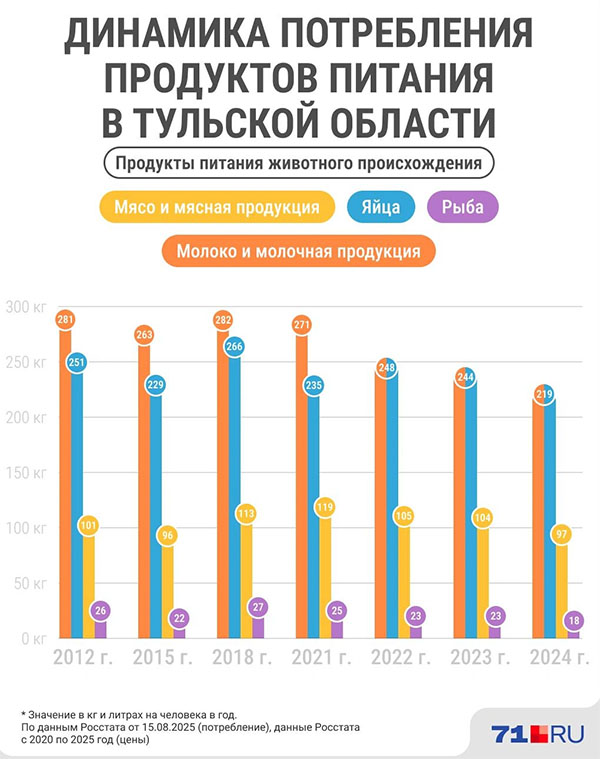 Так все эти продукты относятся к перечню здорового питания. Что еще есть на ЗОЖ, если не рыбу, овощи, мясо… Может просто население Тульской области уменьшилось, стали больше есть готовой еды на заказа и из фаст-фуда и всяких круп/макаронов…