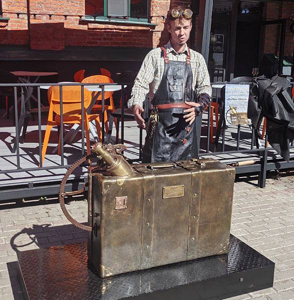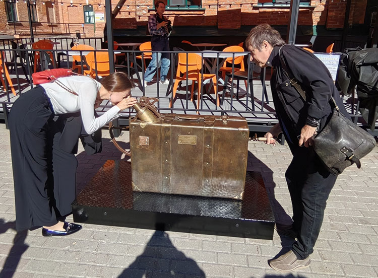 «Шарман-чемодан» — так называется эта удивительная во всех отношениях «штуковина». Придумал её Игорь Золотов, который, в частности, известен прежними, ставшими «изюминками» городской среды, скульптурами («Тулячок» на Металлургов, «Хвост» возле Политеха и «Блоха&Левша» на Ликёрке же).