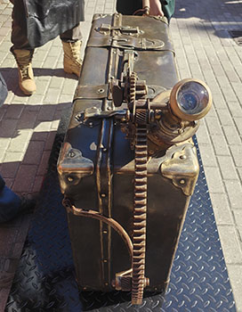 Внешне — это латунный чемодан, внутрь которого направлена подзорная труба, сбоку — ручка. Если ее покрутить, то начнет работать динамо-машина, внутри чемодана включатся лампочки, играет музыка как в шарманке, м смотрящему в подзорную трубу открывается… Что именно, увидите, когда придёте. Одно скажу — это то, что мы так любили в детстве, о чём вспоминаем подчас со светлой грустью…