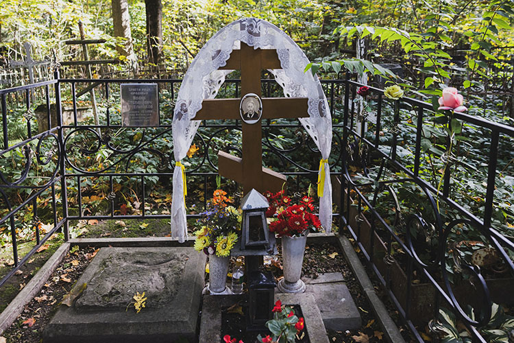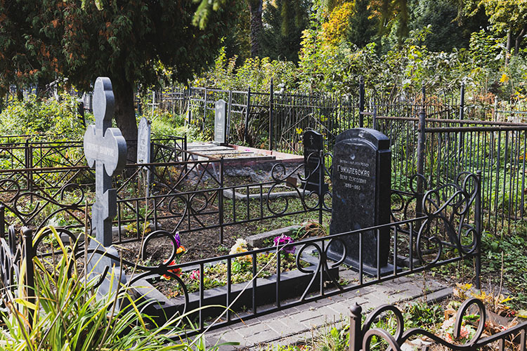 Вера Гумилевская покоится при входе на кладбище, справа, под елочкой