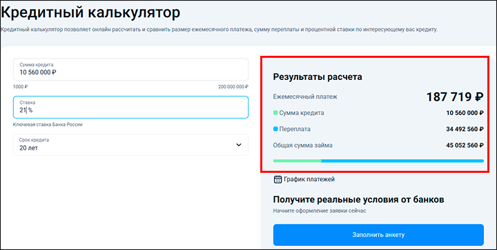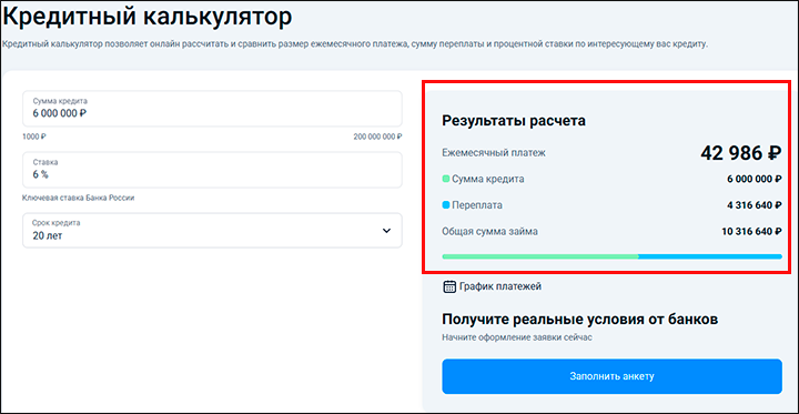 Сайт «Банки.ру», расчет выплат по кредиту, скриншот