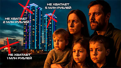 Но и это не всё! Новостройки предлагаются «в бетоне», т. е. это не квартира, куда можно заселиться и жить, а место под квартиру. Средняя цена отделки одного квадратного метра такого «жилья» — от 60 до 100 тысяч рублей. Если брать среднюю цену — 80 тысяч, получаем ещё 8 миллионов рублей! Что получается? Правильно: никакой квартиры для многодетной семьи не будет. На неё банально не хватит денег, даже с учётом семейной ипотеки. А каким должен быть доход, чтобы хватило? По самым скромным подсчётам, если детей трое и мама не работает (а когда ей работать?), глава семьи должен зарабатывать не меньше 350 тысяч рублей. Это зарплата топ-менеджера. Причём без учёта расходов на ремонт. С ремонтом за 8 миллионов — а деньги нужно вложить в квадратные метры в течение года-двух — «семейку» не тянет даже топ-менеджер.