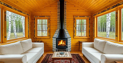 Избушка имеет традиционный вид: небольшая, окрашена в желтый цвет, а оконные рамы украшены узорами. Центральное место внутри занимает шестиметровая изразцовая печь. Рядом расположены белые диваны, разделенные небольшим кофейным столом и старинным ковром. Интерьер выполнен из дерева, окна панорамные с видом на поляну с березами.