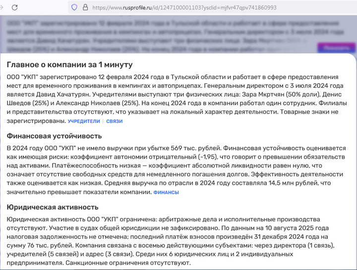 Если мы посмотрим информацию на сайте «Руспрофиль», то мы увидим, что компания ООО «Усадьба Куликово Поле» была создана и зарегистрирована в Куркинском районе в феврале 2024 года. Основной вид деятельности — работа по предоставлению мест для временного проживания в кемпингах, жилых автофургонах и туристических автоприцепах.