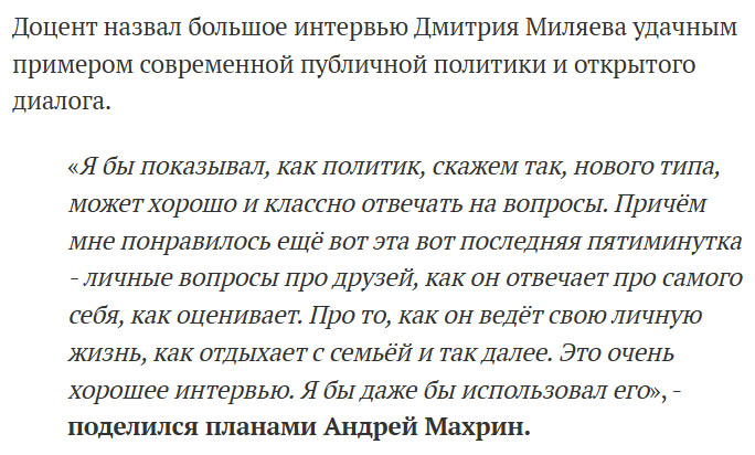 Издание отмечает, что кандидат политических наук, доцент ТулГУ Андрей Махрин, планирует использовать это интервью в учебном процессе. Оно войдёт в курс подготовки студентов по направлениям «журналистика», «реклама и связи с общественностью», «медиакоммуникации» и «политология».