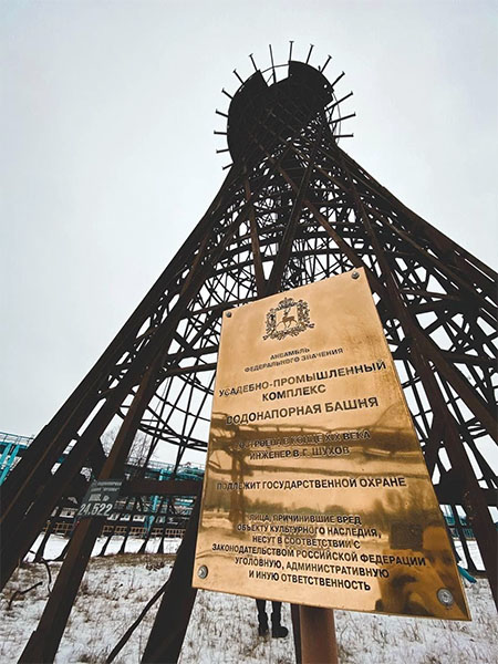(Фамилия инженера башни читается отчетливо. Однако герб на табличке и конструкция на заднем фоне скорее свидетельствуют, что это башня в Выксе — «Bloha-Info»)