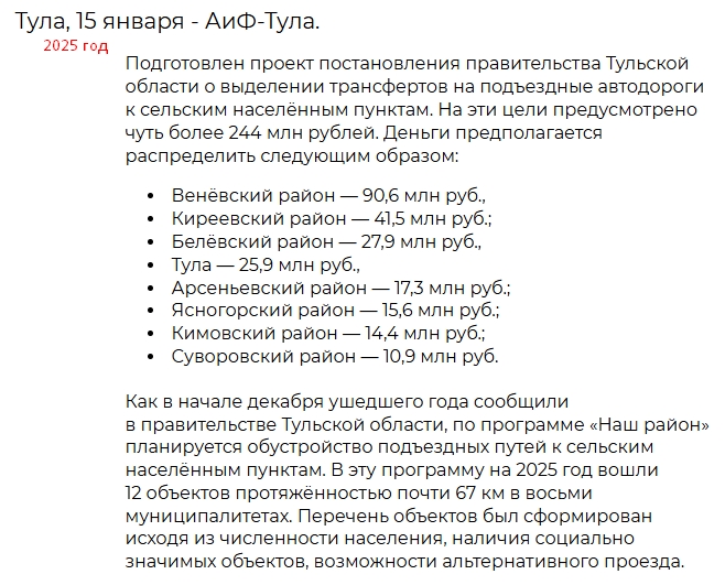 С 2025 года в Тульской области работает программа «Наш район». По ней выделяют деньги для небольших населённых пунктов, в том числе на подъездные дороги.