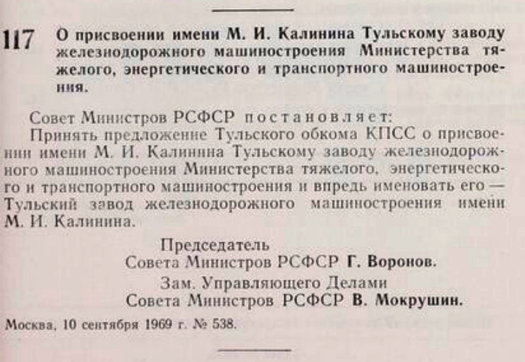 С удивлением узнал, что оказывается Тульский завод желдормаш не носит уже имя М. И. Калинина, а назван в честь совсем другого человека. А ведь имя Всесоюзного старосты предприятию было присвоено Постановлением Совета Министров РСФСР и на заводе было две мемориальные доски ему посвященные.