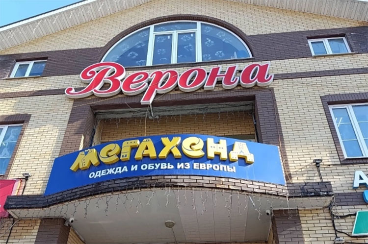 Торговый центр на ул. Металлургов. Похоже меня, фотографировавшего вывески и входные группы, пристававшего к продавцам с вопросом «Когда поменяете?», приняли за проверяющего и бодро обещали «совсем скоро», «буквально на днях» все вывески поменять. В одном из ширпотребных магазинов одежды, название из пяти букв уже завесили под замену. Вернее, заменят только три, а две (по счастью) в латинице и кириллице совпадают.