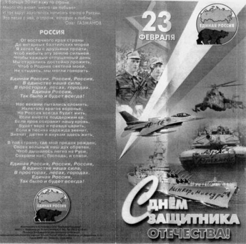 Тираж для Владимирской области относительно небольшой – всего 80 тысяч экземпляров. Но доставлялась листовка по конкретным адресам и с вполне конкретной предвыборной целью. Деятели регионального отделения «ЕдРа» решили поиграть на патриотизме и поздравить листовочкой земляков с «Днем защитника Отечества».