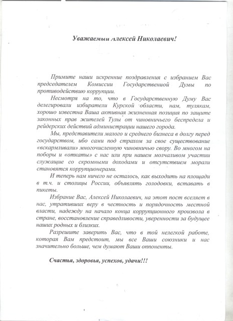 Тульские предприниматели собрали 1212 подписей против рейдерский действий городских властей. Адресат — Председатель Комиссии Госдумы по борьбе с коррупцией Алексей Волков