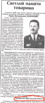17 августа Тула попрощалась с легендой местного сыска (и здесь нет полагающегося по случаю преувеличения) Павлом Бадинцяном. За анонимной подписью «Руководство УВД Тульской области» был растиражирован некролог. Нет сомнений – те, рядовые сотрудники, кто непосредственно писал прощальные слова, были искренни, ведь о Павле Вачакановиче ещё при жизни слагали стихи. Что же до тех, кто как бы подписывал прощальные слова…