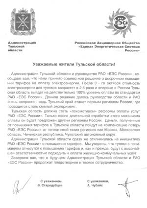 Администрация Тульской области и руководство РАО «ЕЭС России», сообщаем вам, что нами принято совместное решение о досрочном повышении тарифов на оплату электроэнергии. После 3 — го октября стоимость электроэнергии для туляков возрастет в 2,5 раза и впервые в России Тульская область выйдет на действительно 100% уровень оплаты по стандартам РАО «ЕЭС России». Данное решение далось руководству области и РАО очень непросто — ведь Тульский край станет первым регионом России, где проводится столь смелый эксперимент.