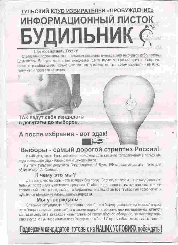 Распространителя столь необычного агитационного материала задержать не удалось, но повление подобных листовок в других округах Тулы, могут осложнить избирательную кампанию некоторых кандидатов в депутаты.