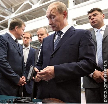 Через три минуты после начала осмотра экспозиции Владимира Путина окружили рабочие. Они, разумеется, спрашивали его, будут ли у предприятия заказы («По экспорту сейчас заказы хорошо идут»,— отвечал премьер. «А нам свои бы получить, российские».— «А это Министерство обороны решает»…)