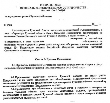 По нашей информации в последнее время ряд тульских предприятий получили проект весьма странного договора с областной администрацией.