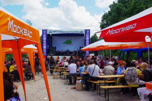 Последний раз на фестивале Крапивы в Крапивне довелось побывать два года назад, в 2008-ом. Первое, что на этот раз бросилось в глаза, большие красные шатры «Моспиво» и «Москвас», под которым народ  лениво потягивал  пиво (всего три или четыре сорта) и квас из одноразовых пластиковых стаканов, закусывая жареным шашлыком по 100-200 рублей за 100- граммовую порцию или пирогами с крапивой и мясом. Поначалу это раздражало, поскольку половина площади была заставлена красными шатрами, из-за которых трудно было разглядеть сцену. Не развернутся  особо, не почудить. Но затем, когда мы с теплой компанией уселись за деревянные столы с пивом и шашлыком, это даже понравилось.