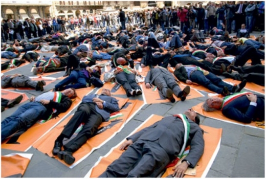 В одном из свежих выпусков «Русского репортера» опубликовали фото антиправительственной акции, состоявшейся во Флоренции 20 мая. Мэры более 100 городов Центральной Италии в знак протеста прошли маршем по городу и на площади Синьории  улеглись на коврики с надписью: «Они бросают ваше самоуправление на землю».