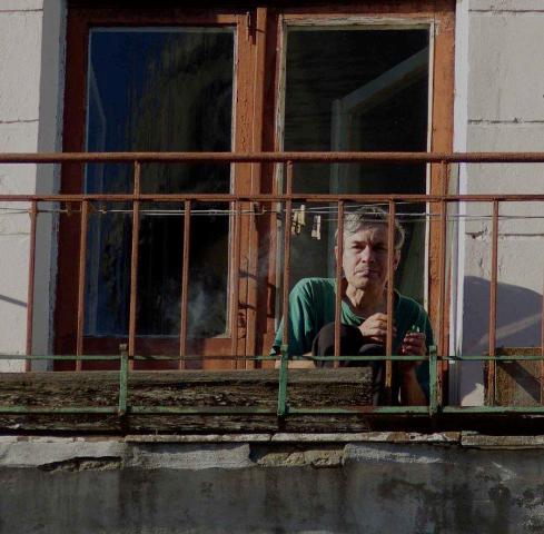 Он сидел на балконе и курил. Внизу проезжали автомобили и троллейбусы и куда-то спешили люди по своим воскресным делам. Мужчина никуда не спешил, потому что он у себя дома. И глядит на всех свысока. Может быть поэтому мне и захотелось его снять и показать всем вам.