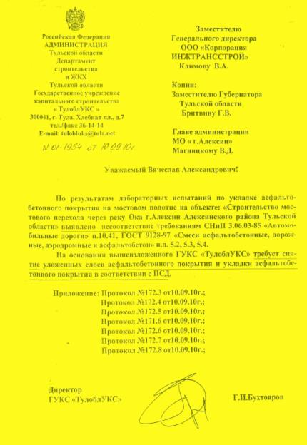 В этом письме Бухтояров усомнился в порядочности ООО «Корпорация «Инжтрансстрой», которое нарушило СНиП «По асфальтобетонному покрытию на мосту».